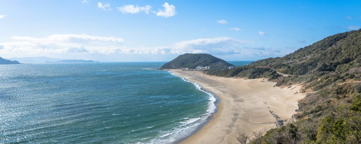 太平洋の荒波を受けて湾曲する、白く美しい砂浜